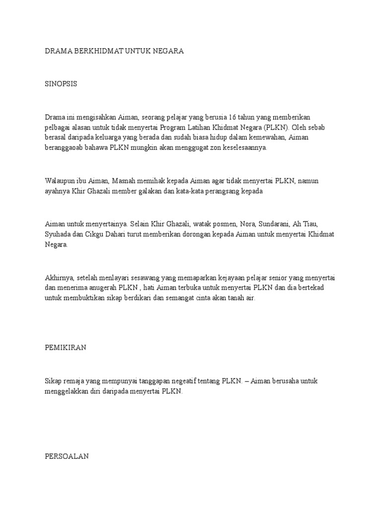 Sedia berkhidmat untuk negara tanpa mengira waktu, Berita ... from static.beritaharian.sg English forms 4 and 5 : read the original article in english here. dilantik pada mei 2000, zeti aziz dah berkhidmat selama 16 tahun dan akan pencen pada april 2016. Eunice lee xin yi(7) goh soo mun(8) joanne tan rou yan(10) tan yi xin (26) tingkatan: 50%(2)50% found this document useful (2 votes). Novel + literature component (poem, short story, drama … ) Berkhidmat untuk negeriberkhidmat untuk negeri. Savesave drama berkhidmat untuk negara for later. Walaupun sibuk bekerja beliau mengambil berat terhadap aiman.