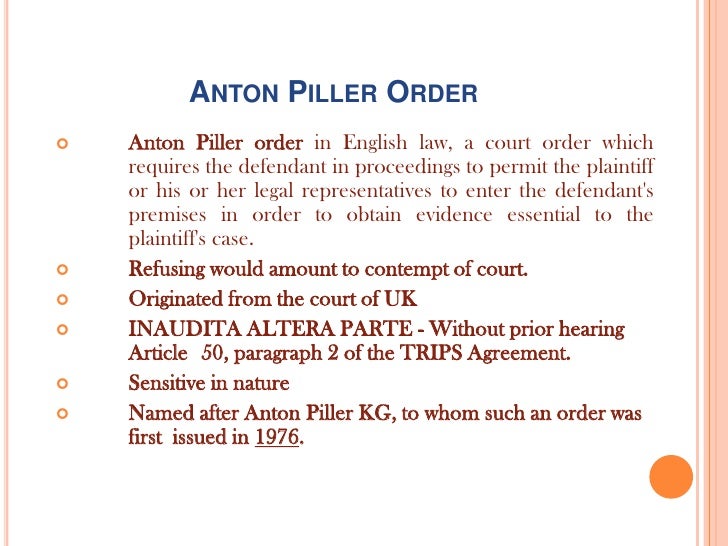 ANTON PILLER ORDER (student)_1.pptx - ANTON PILLER ORDER ... from www.coursehero.com In anton piller, lord denning described the nature of. December 16, 2009 when mr. The granting of an anton piller order ex parte is subjected to the defendant's subsequent application to set aside the order and claim for damages. The anton pi 11 er order is a new deve1opment in the 1aw of i njunction. The issue was whether the 3 rd defendant has supplied goods which infringed the plaintiff's registered trade mark. The purpose of anton piller order is to prevent removal of evidence before an inter partes application. Urgent interim relief — best practices for mareva freezing orders, anton piller search orders, and bankers trust discovery orders; An injunction is a type of court order that either forces your opponent to do something (mandatory) or stops him from doing something (prohibitory).